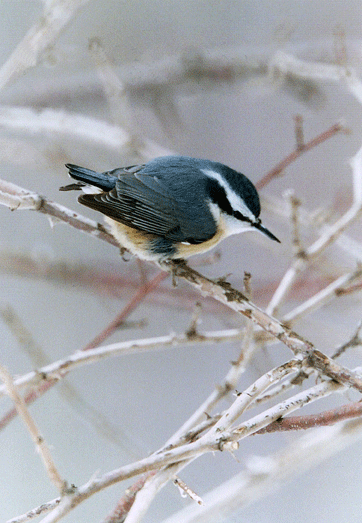 The Red-breasted Nuthatch is a small bird inhabiting the coniferous and boreal forests of Canada, S.E. Alaska, the mountainous areas of the western U.S. and northeast into the Appalachians, nesting farther north and higher in the mountains than its relatives.